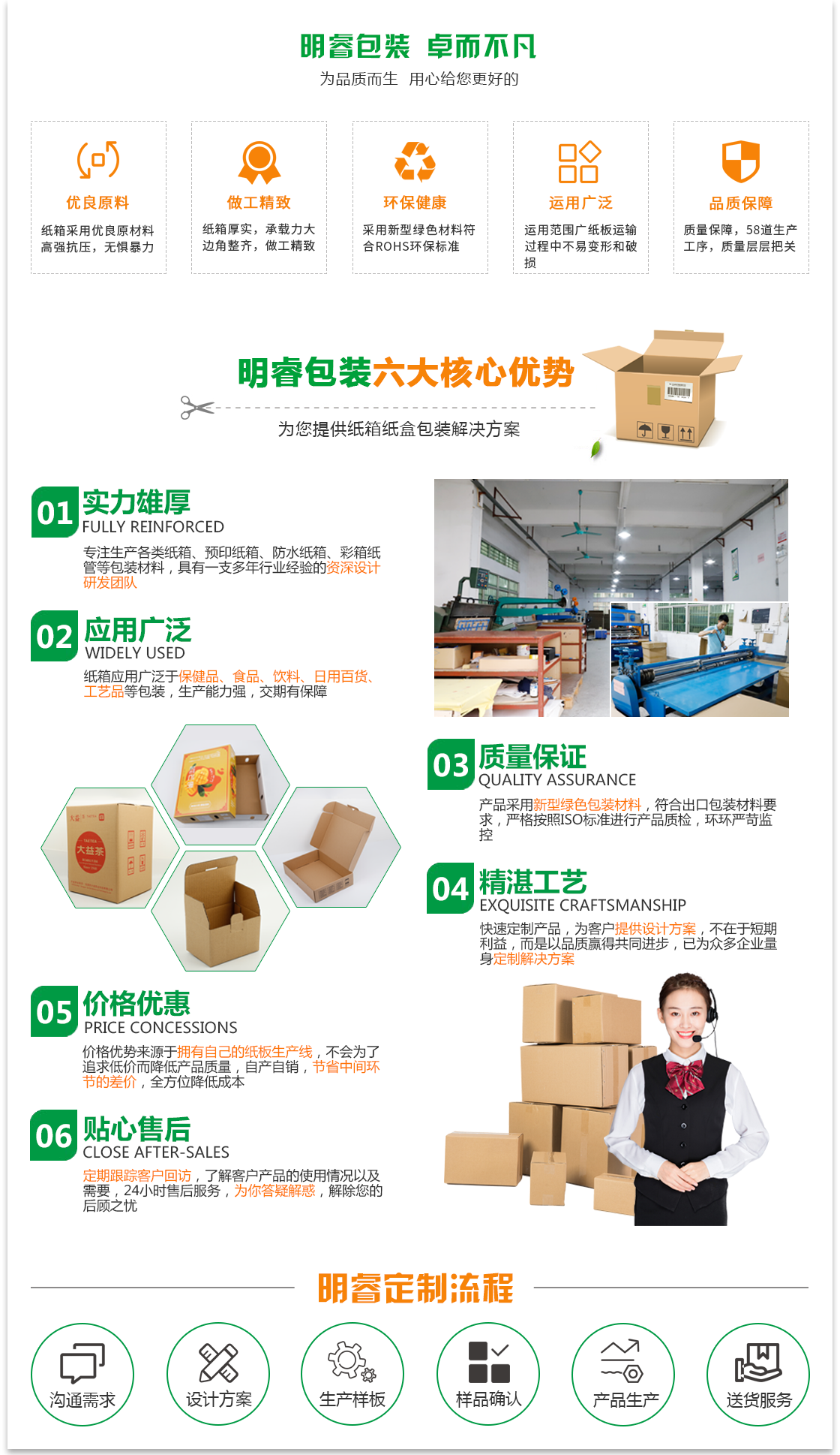 東莞市明睿包裝材料有限公司成立于2015年,位于中國(guó)制造業(yè)名城----東莞,工廠(chǎng)地址位于廣東省東莞市東城街道柏洲邊新田街13號(hào)2棟,環(huán)境優(yōu)美,交通便利 本公司專(zhuān)業(yè)生產(chǎn)各類(lèi)紙箱、預(yù)印紙箱、防水紙箱、彩箱、彩盒、啤盒、刀卡、紙護(hù)角、紙管等包裝材料。主要生產(chǎn)設(shè)備:高速印刷機(jī)一臺(tái),全自動(dòng)粘釘一體機(jī)一臺(tái),三色開(kāi)槽印刷機(jī)一臺(tái),半自動(dòng)糊箱機(jī)兩臺(tái),啤機(jī)一臺(tái),打角機(jī)一臺(tái),高速單刀分紙機(jī)一臺(tái),碗刀分紙機(jī)1臺(tái),釘箱機(jī)兩臺(tái)。主要客戶(hù)有食品、電子、五金、玩具等知名企業(yè)。自創(chuàng)立以來(lái)一貫秉承:專(zhuān)業(yè)、認(rèn)真、快,信守承諾,以人為本,客戶(hù)至上,追求卓越的經(jīng)營(yíng)理念...[查看詳情]